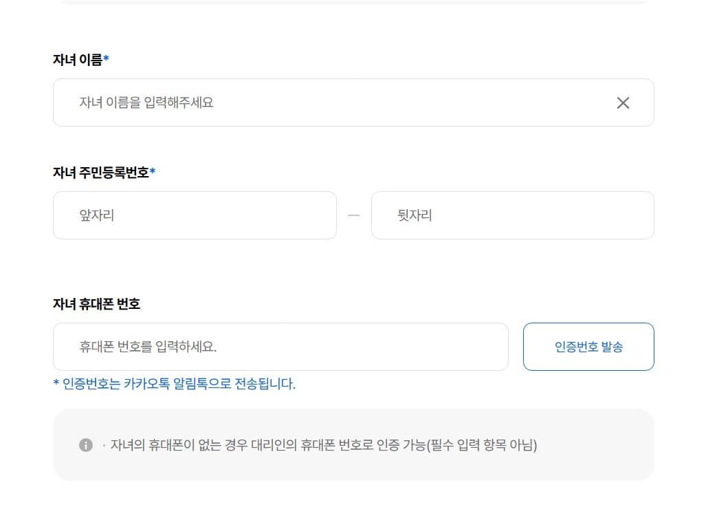 그 후에 자녀를 등록합니다. 주민번호 넣으셔야하구요. 자녀 휴대폰이 없는 경우는 부모의 휴대폰으로 등록 가능해요