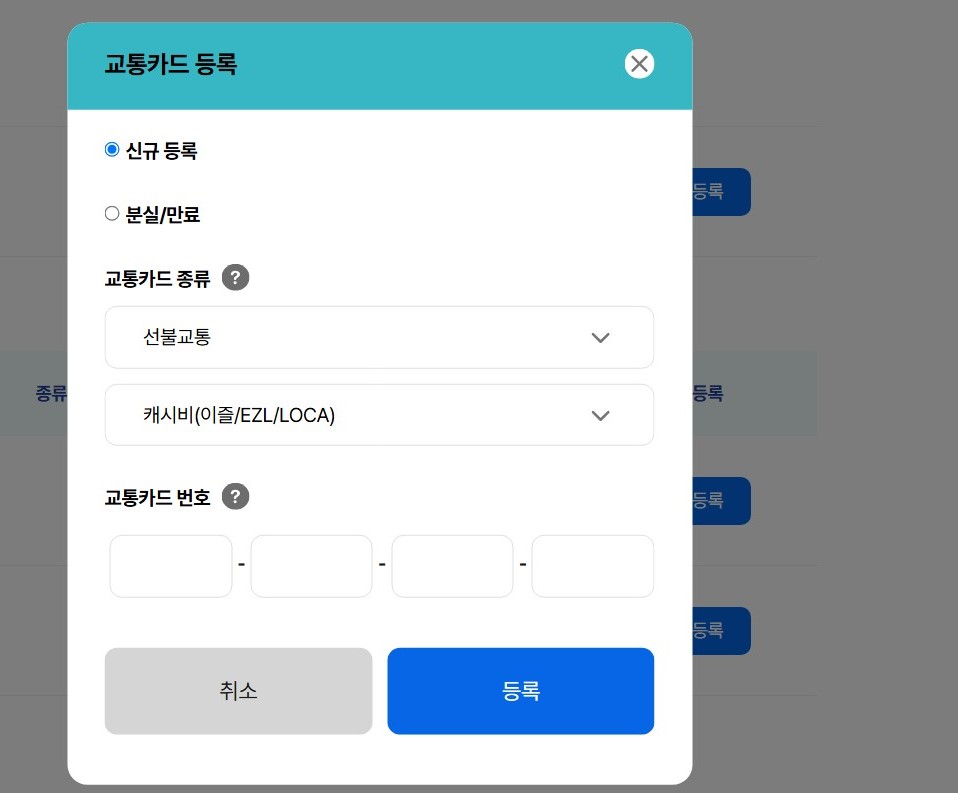 그리고 다시 경기도 어린이청소년 교통비지원 사이트로 돌아와서 카드번호 등록해줍니다.